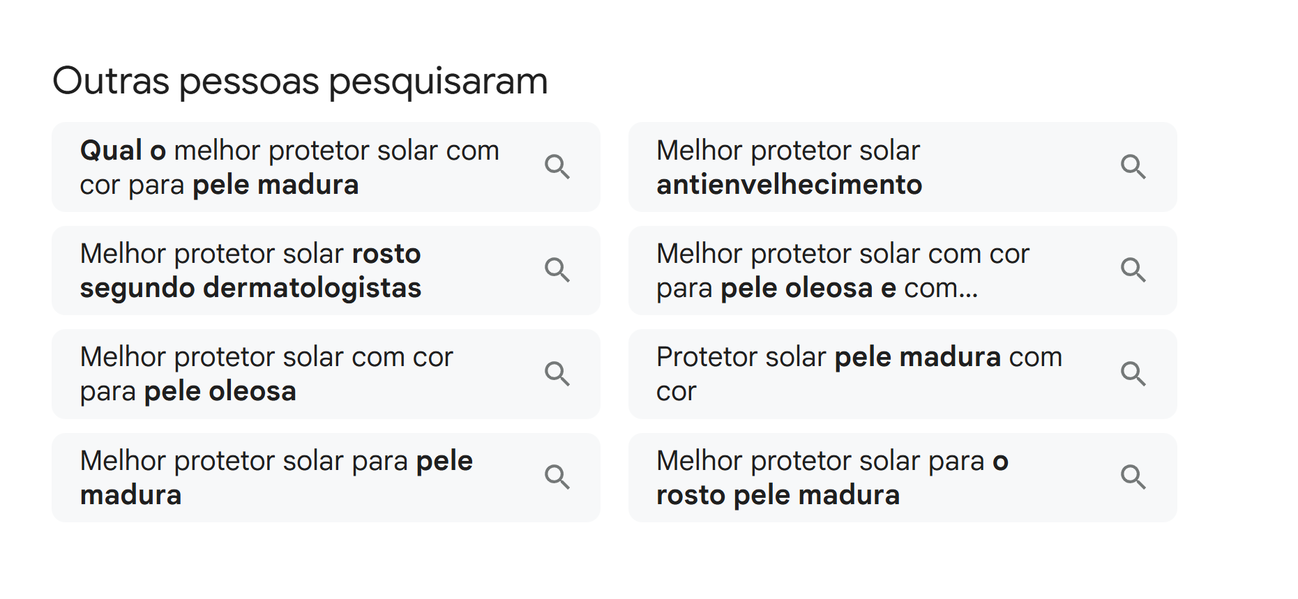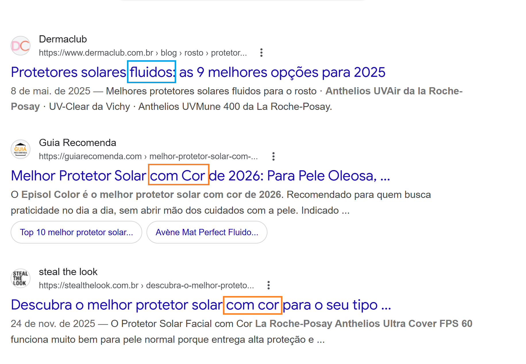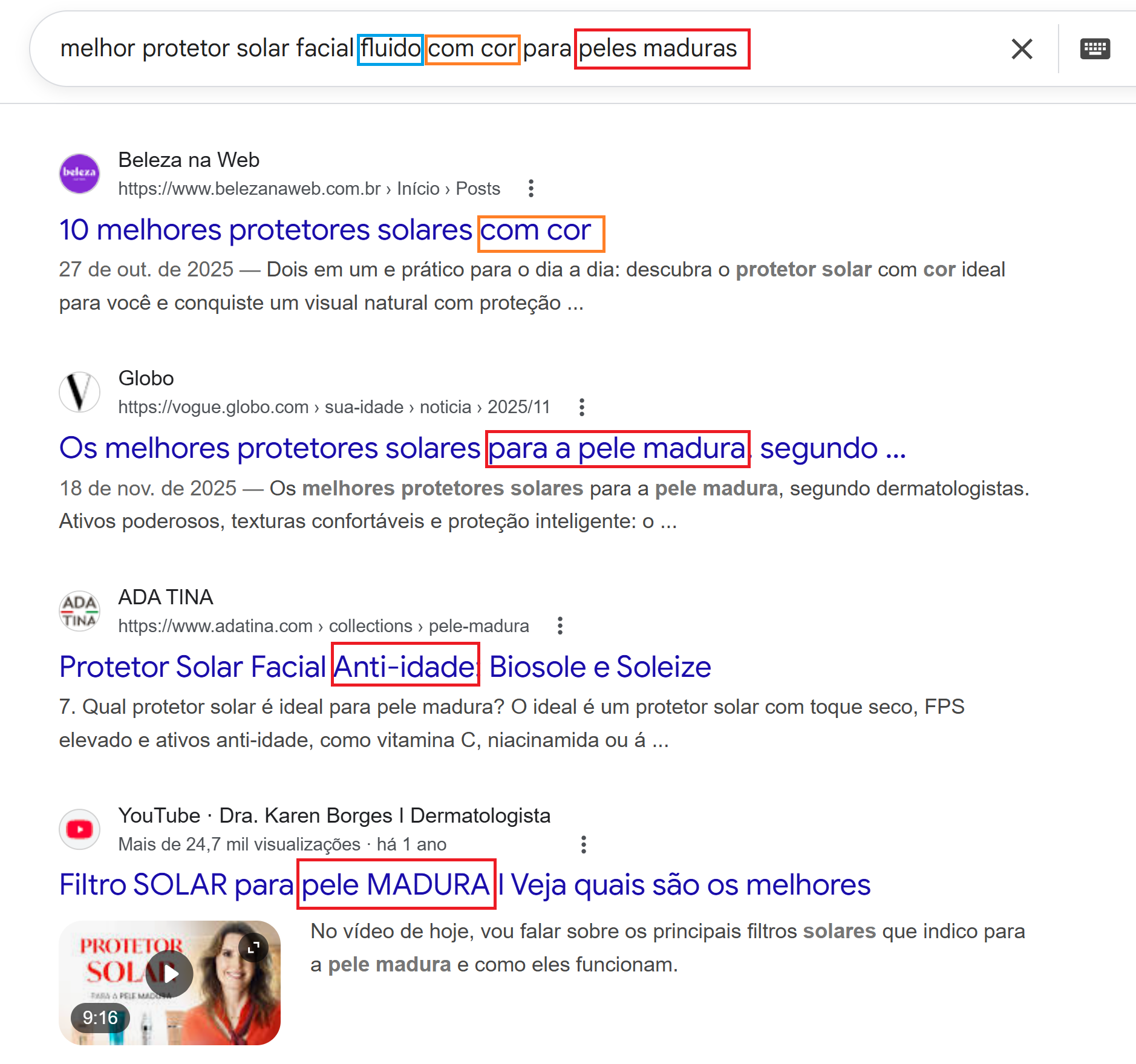 Lembra da query “melhor protetor solar facial fluido com cor para peles maduras”, que usamos como exemplo?